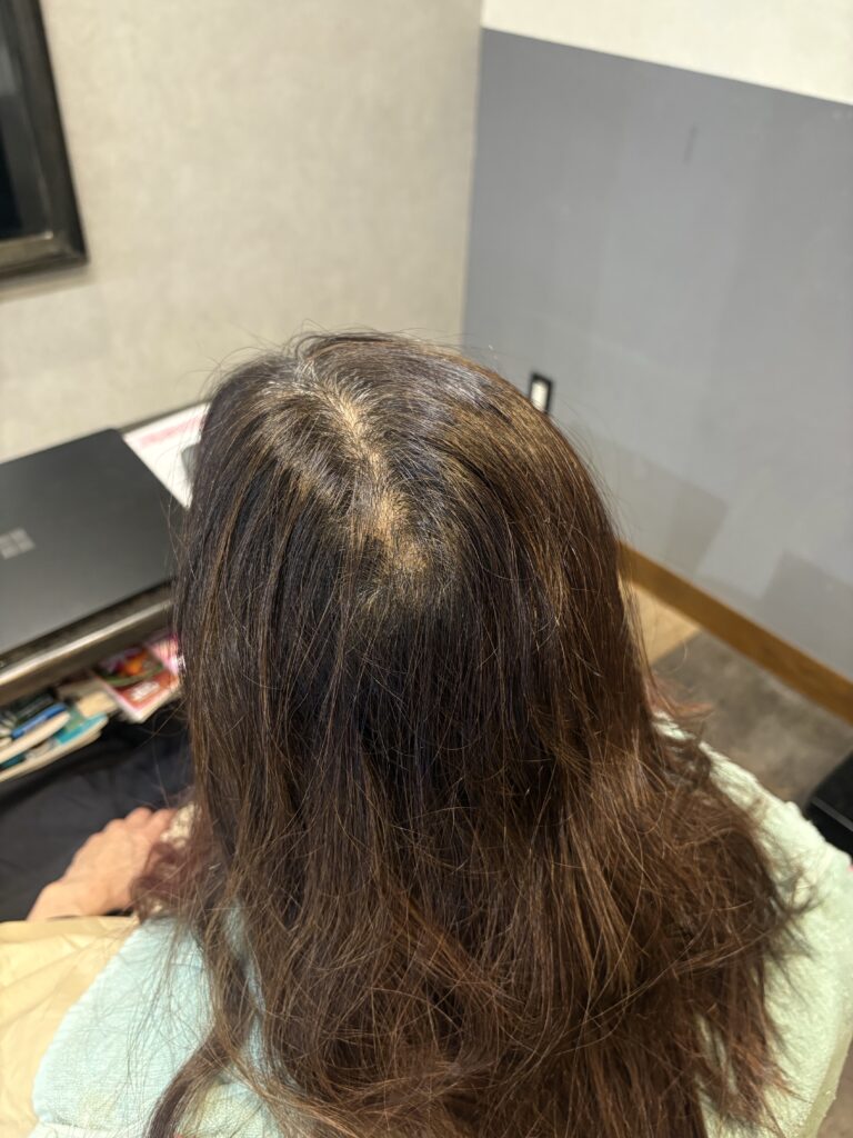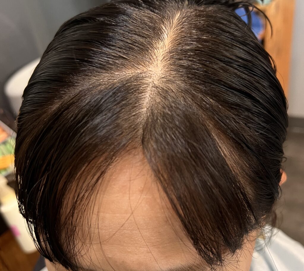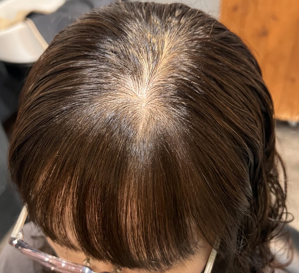トップの分け目付近には、小さな円形脱毛症のようなものが複数あり根元が余計に割れやすく立ち上がりにくい状態でした。