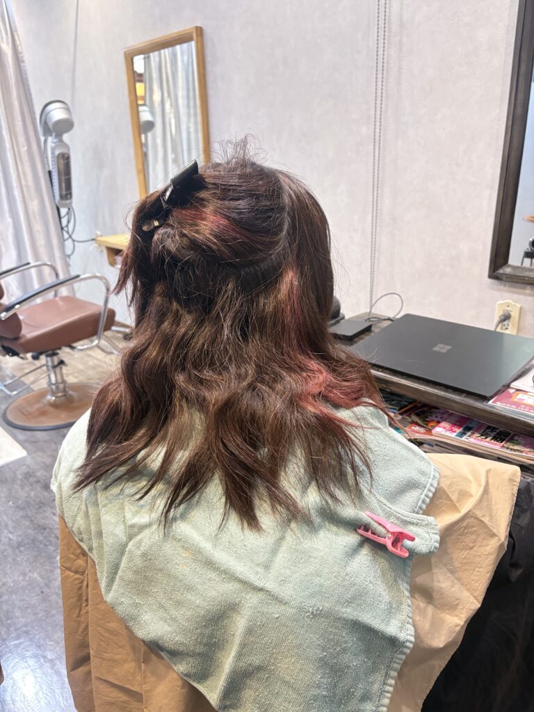 髪への負担をできるだけ抑えるために縮毛矯正は内側のみにあえて施術。