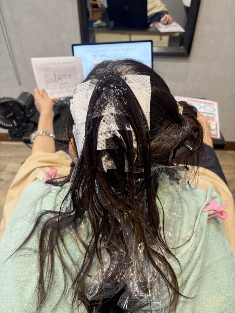 名前の通り髪に薬剤をつけながらクロスにして施術していきます